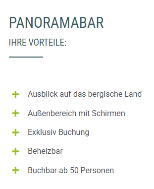 Entfliehen Sie dem Alltag und erleben Sie die einzigartige Atmosphäre der Panoramabar am Lüderich mit atemberaubendem Ausblick ins Bergische Land. Kontaktieren Sie uns, um Ihr individuelles Event zu planen und einen unvergesslichen Aufenthalt hoch über dem Bergischen Land zu genießen